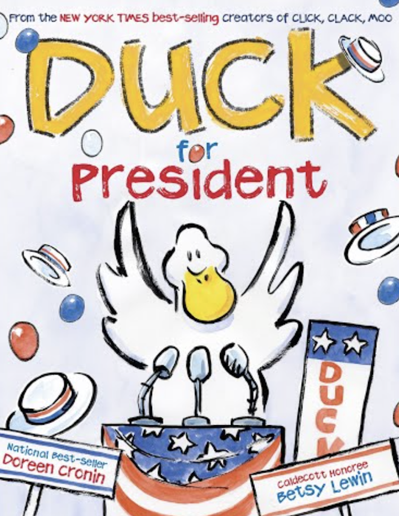The book ‘Duck for President’ is written by Doreen Cronin and illustrated by Betsy Lewin. The story is about a duck who is unhappy with how the farm is being run, so he decides to challenge the farmer through a democratic process. In turn, he wants to be a governor and eventually the President! By the end he realises that it is all hard work and wants to return to the farm! This book introduces politics to children with humour.