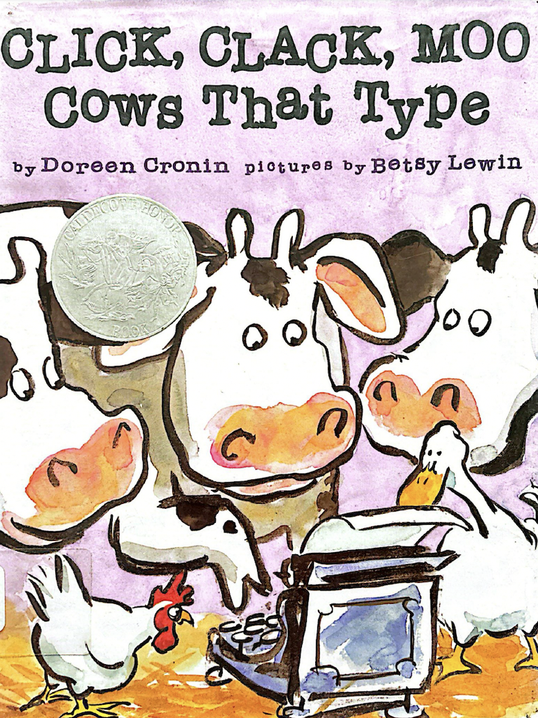 The book ‘Click, Clack, Moo’ is written by Doreen Cronin and illustrated by Betsy Lewin. In this story, the the farmer has a problem because his cows like to type. A hilarious story about when the cows start to leave notes for the farmer and become more demanding. But when will it end?